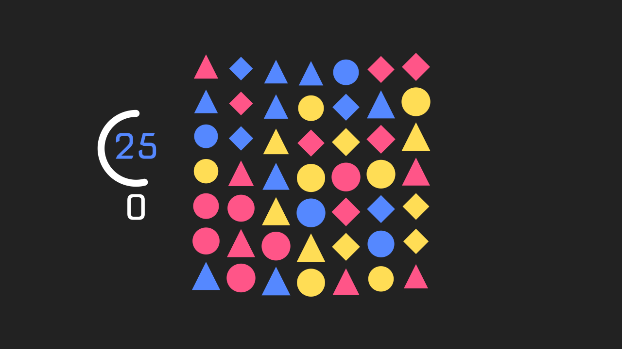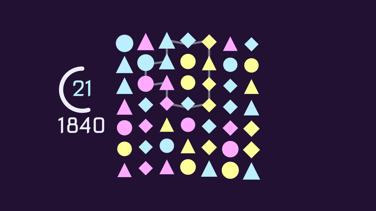 Draw chains of symbols, ensuring that each matches the color or shape of the next. Earn bonus points by drawing full loops, and even more for containing other symbols within those loops! Be careful, though. You have limited time and turns.
